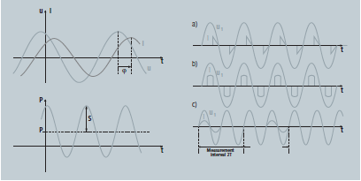 Los siguientes tipos de corriente pueden ser medidos con el KL3403: Curva de corriente y tensión para el control de fase (a), el control de duración del pulso (b) y control de ráfaga de disparo (c), el intervalo de medición se establece análogo al intervalo de control.