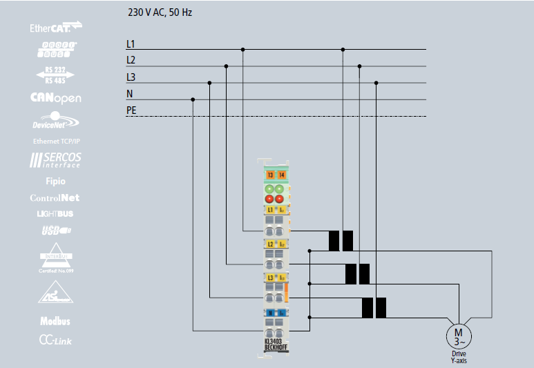 La medición de las variables de consumo de energía en un circuito conectado es posible utilizando el terminal de bus KL3403 y el terminal EtherCAT EL3403. Los terminales dan directamente los valores eficaces de tensión, corriente y potencia activa y totalizan el consumo de energía internamente; otros parámetros se pueden calcular sobre la base de estos valores.