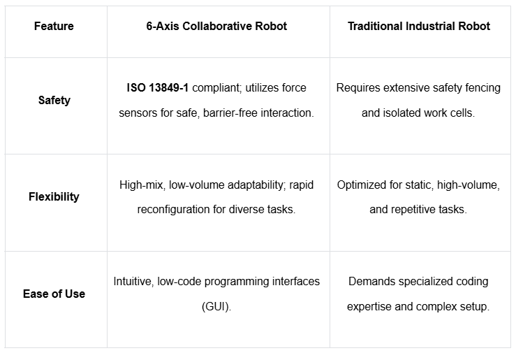 A diferencia de la automatización tradicional diseñada para el aislamiento, el Robot colaborativo de 6 ejes está diseñado para la interacción. Aunque iguala la capacidad mecánica (o la precisión) de los sistemas heredados, su valor diferencial reside en su filosofía de diseño “sin barreras”, que le permite operar con seguridad junto a los humanos sin barreras físicas.