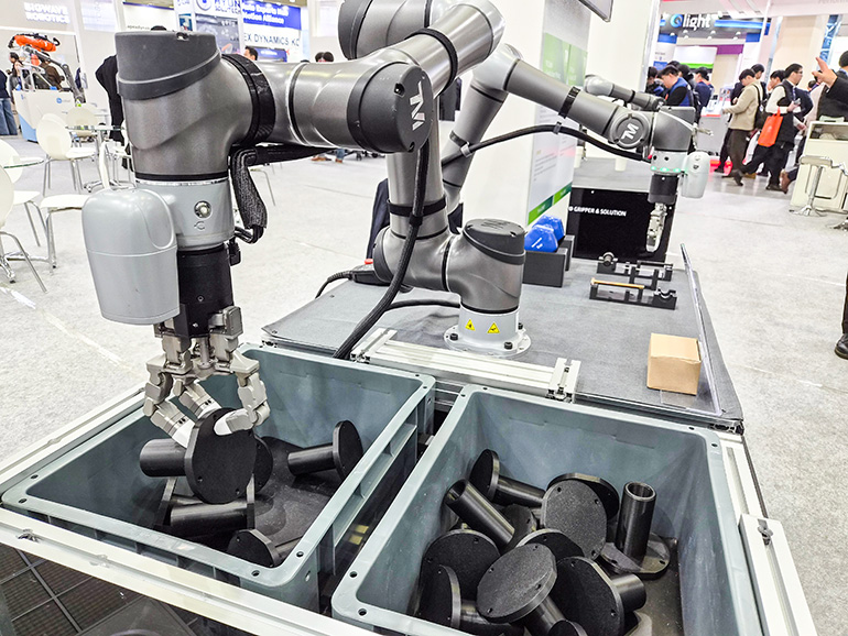 Tesollo demostró su agarre articulado DG-3F-M con el brazo de cobot TM5S de Techman para tareas como la recolección de basura y montaje.